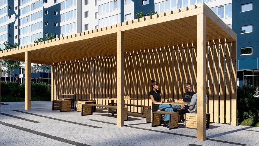 лаунж-зоны с удобными лавочками для отдыха взрослых.