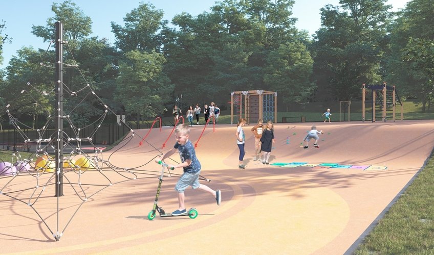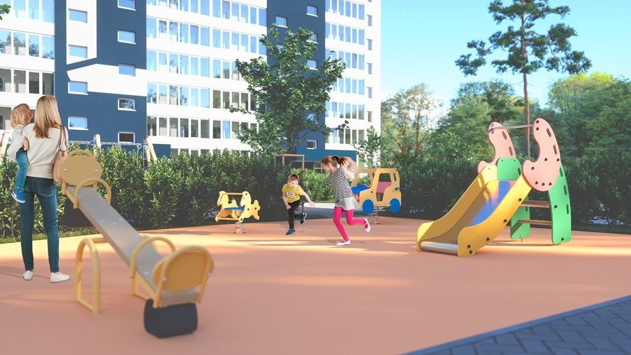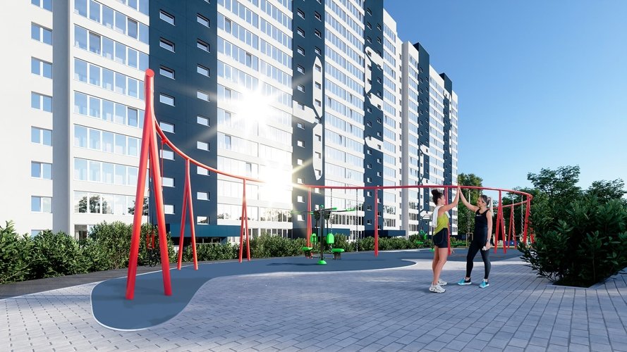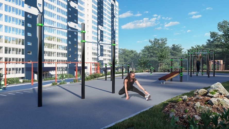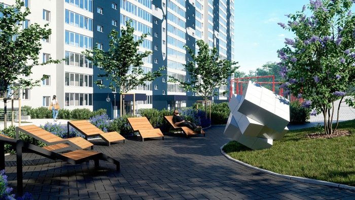Территория комплекса благоустроена: здесь есть детские игровые и спортивные площадки, прогулочные зоны, места для отдыха. Общая площадь зелёных зон превышает 10 000 м². На территории предусмотрены: три детские площадки, спортивные площадки, включая баскетбольную и для воркаута; прогулочные аллеи;