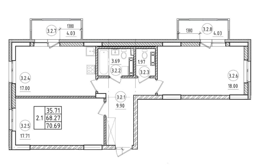 Площадь от 70.7 м2